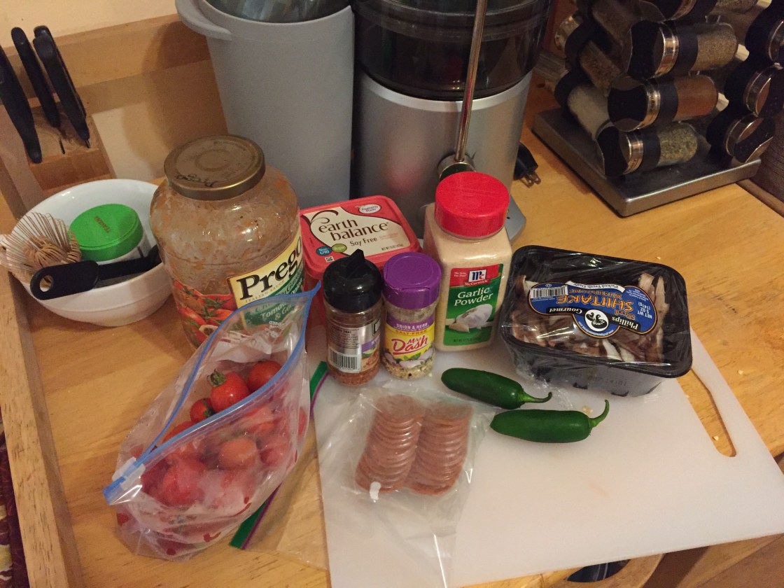 *I mixed the sauce, tomatoes, pepperoni’s, and bell peppers, and let that simmer for about 30 minutes. While the sauce simmered, I seasoned and sautéed the mushrooms and jalapeno’s for about 5-7 minutes. Once I was done sauteing I let that sit to the side until the sauce was done. Then I mixed everything together.