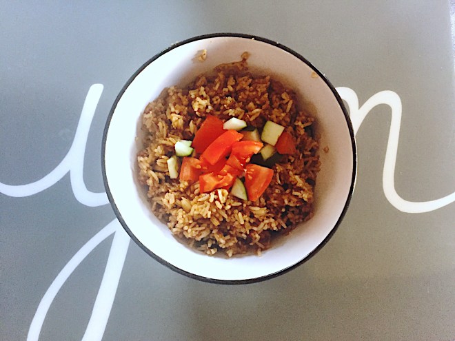 Sautéed mushrooms and fried rice, topped with fresh-cut tomatoes and cucumbers.