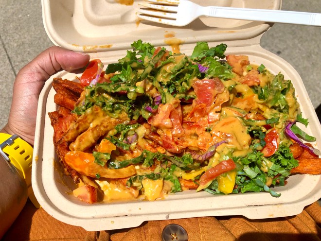 Here we have an order of Smothered Sweet Potato fries with fresh kale, red cabbage, tomatoes, peppers, and one of the most delicious sauces I’ve ever tasted!